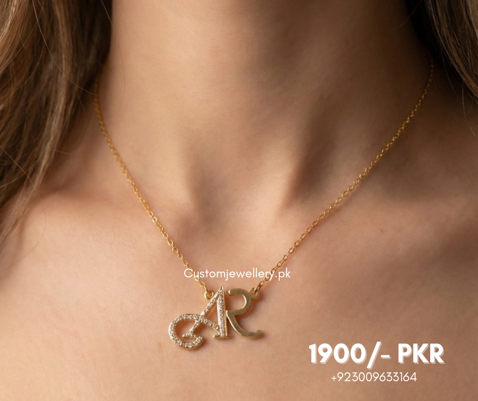 Celebrate your identity with our Initial English Alphabet Necklace, a beautiful blend of tradition and modern luxury. Designed with a graceful Urdu letter, this necklace features a gold-plated finish enhanced with sparkling stone detailing, making it a timeless piece for everyday wear or special occasions.